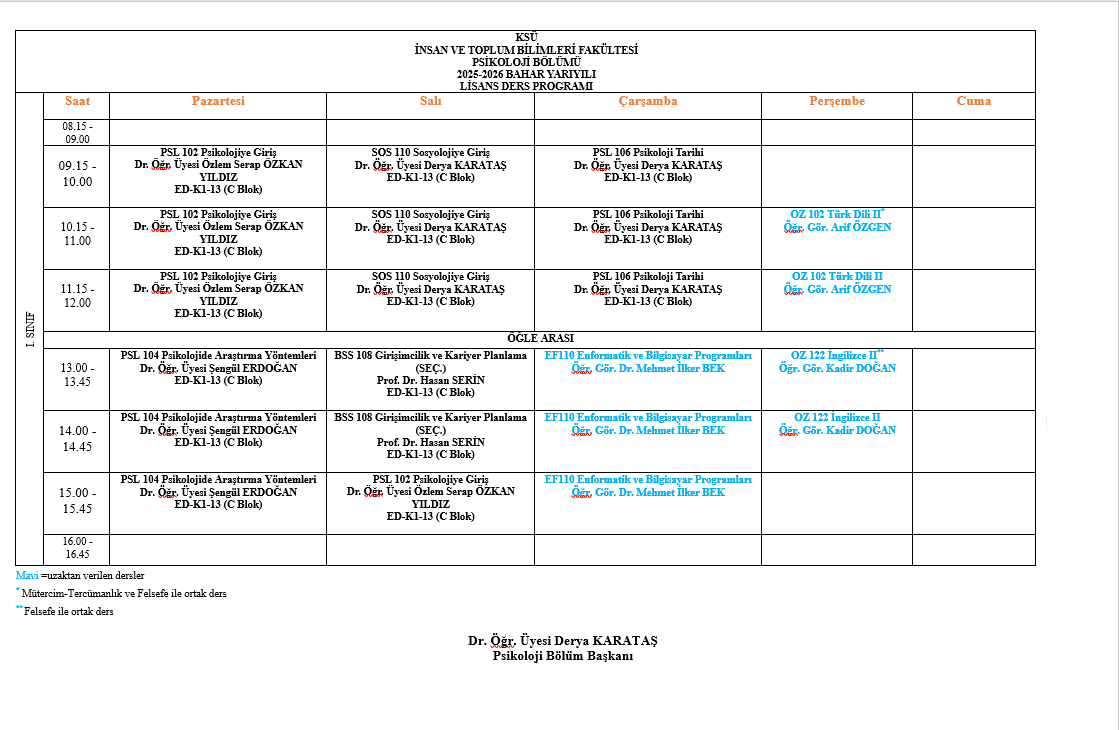 2025-2026 Bahar Dönemi Psikoloji Bölümü Ders Programı aşağıda yer almaktadır. Öğrencilerimize verimli, başarılı ve eğlenceli bir dönem dileriz.